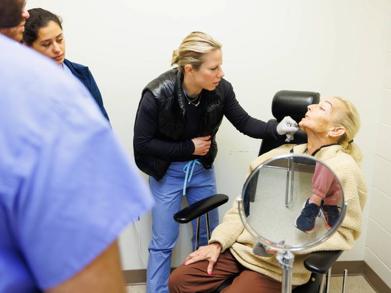Dr. Laura Humphries, associate professor of plastic surgery, examines Dawn Hoge in a post-op follow-up appointment.