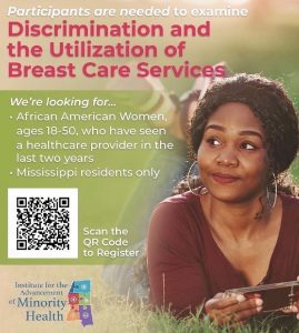 The Institute for the Advancement of Minority Health invites Black women aged 18-50 to participate in a crucial research survey to address the impact of healthcare providers’ implicit bias on the utilization of breast cancer services by Black women in the State of Mississippi.