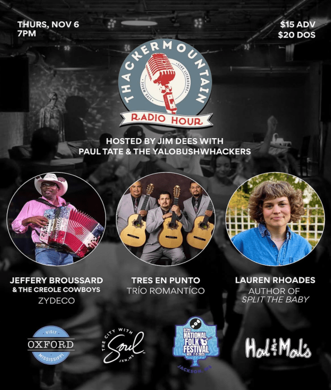 Before the festival officially begins, Thacker Mountain Radio Hour—the beloved Oxford-based music and literature show—will kick things off with a live performance at Hal & Mal’s on Thursday, November 6, at 7 p.m. Hosted by Jim Dees with the Yalobushwhackers house band, the show will feature Mississippi author Lauren Rhoades, whose memoir Split the Baby explores identity and family through a heartfelt and humorous lens.