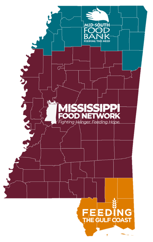 Mississippians are served by three Feeding America Food Banks – Mid-South Food Bank, Mississippi Food Network and Feeding the Gulf Coast. Together, these food banks serve local food pantries across the state in all 82 counties.