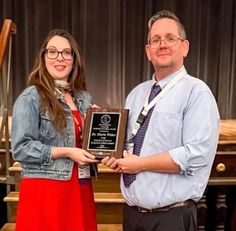 Associate Professor of Physics Dr. Maria Weber (left) was honored as Mississippi Science Teaching Association’s Outstanding College Science Teacher for 2025. The award was presented by MSTA President Dr. Carl DeWitt at MSTA’s annual conference.