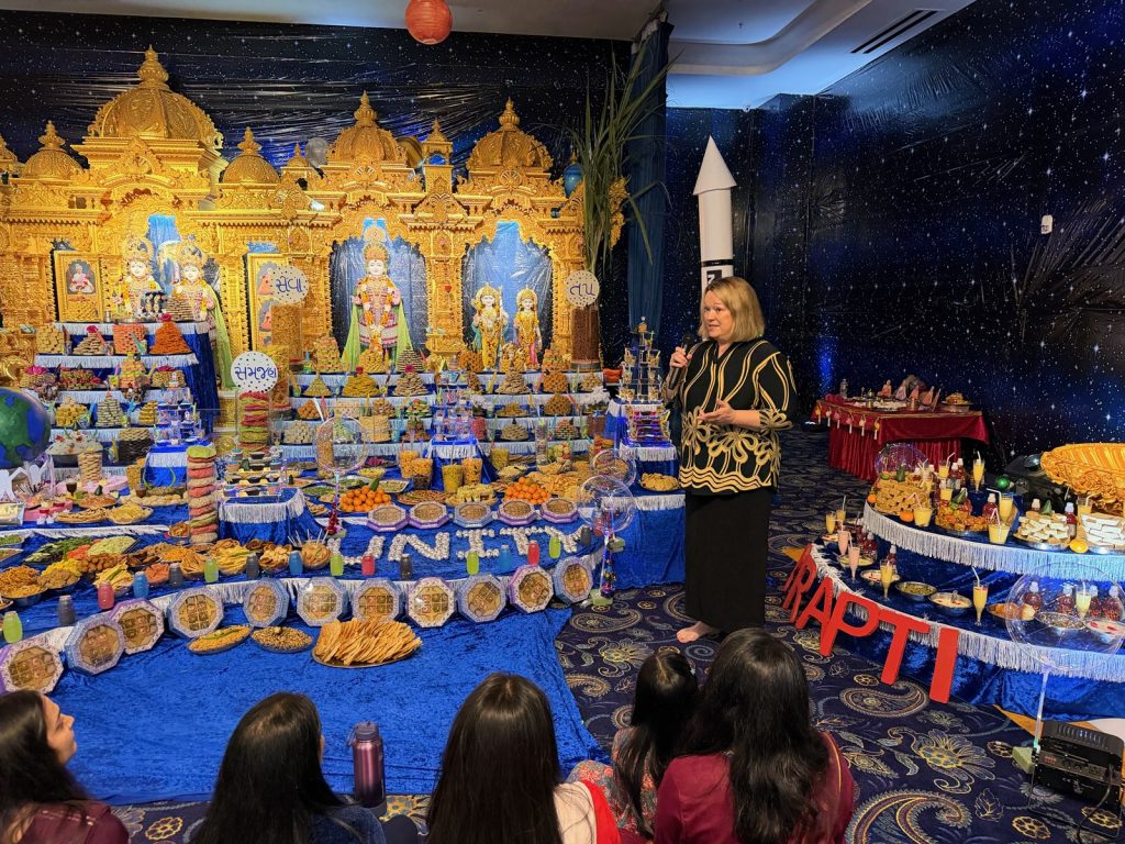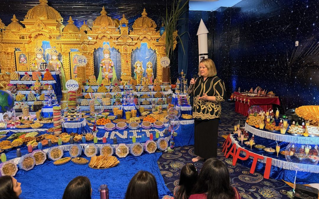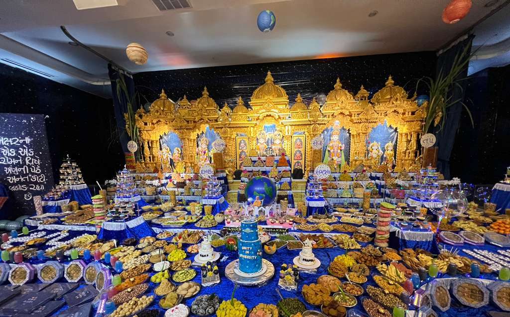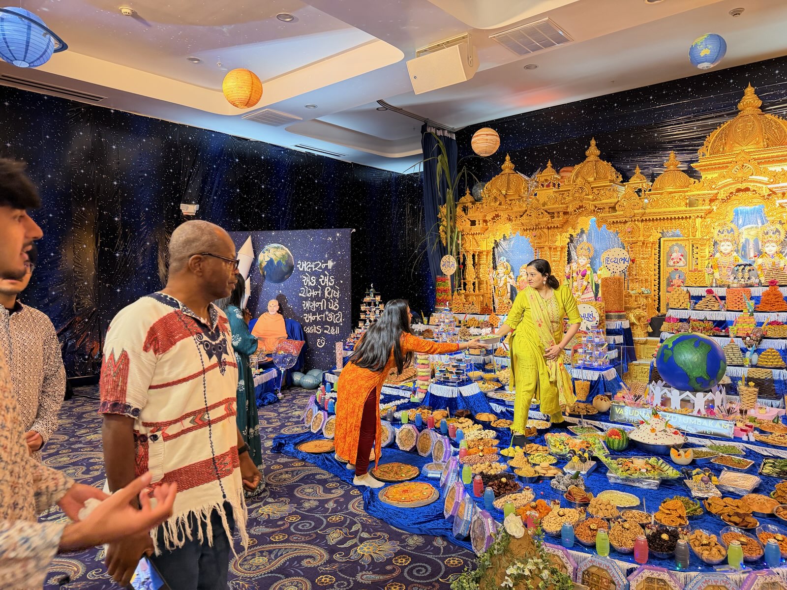 A central feature of the festival was the ‘Annakut,’ or “mountain of food,” in which hundreds of vegetarian dishes prepared by devotees of all ages were beautifully arranged and offered to the Divine. The Annakut served as a symbol of gratitude and devotion while also showcasing the dedication and collective spirit of the community.