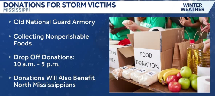 “As we keep praying for those without heat or power in this cold, we are also planning to help,” said Commissioner Gipson. “Beginning at 10:00 a.m. this morning, I have directed the old National Guard Armory on the State Fairgrounds be opened to receive donations from concerned members of the public to assist those affected by Winter Storm Fern, especially in North Mississippi.”