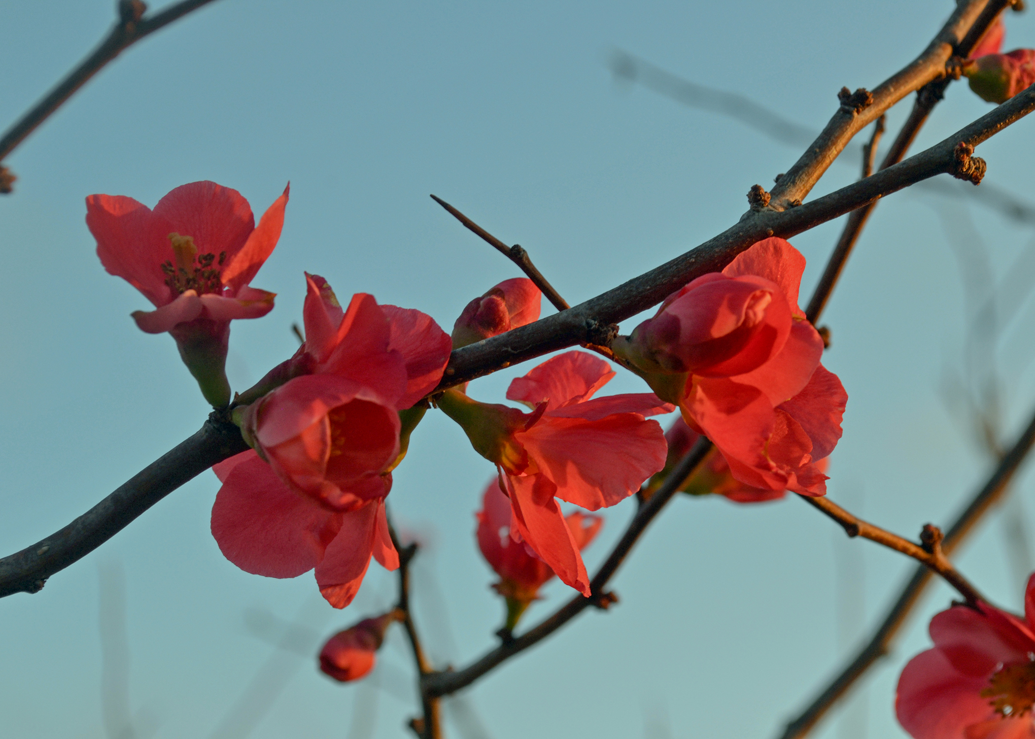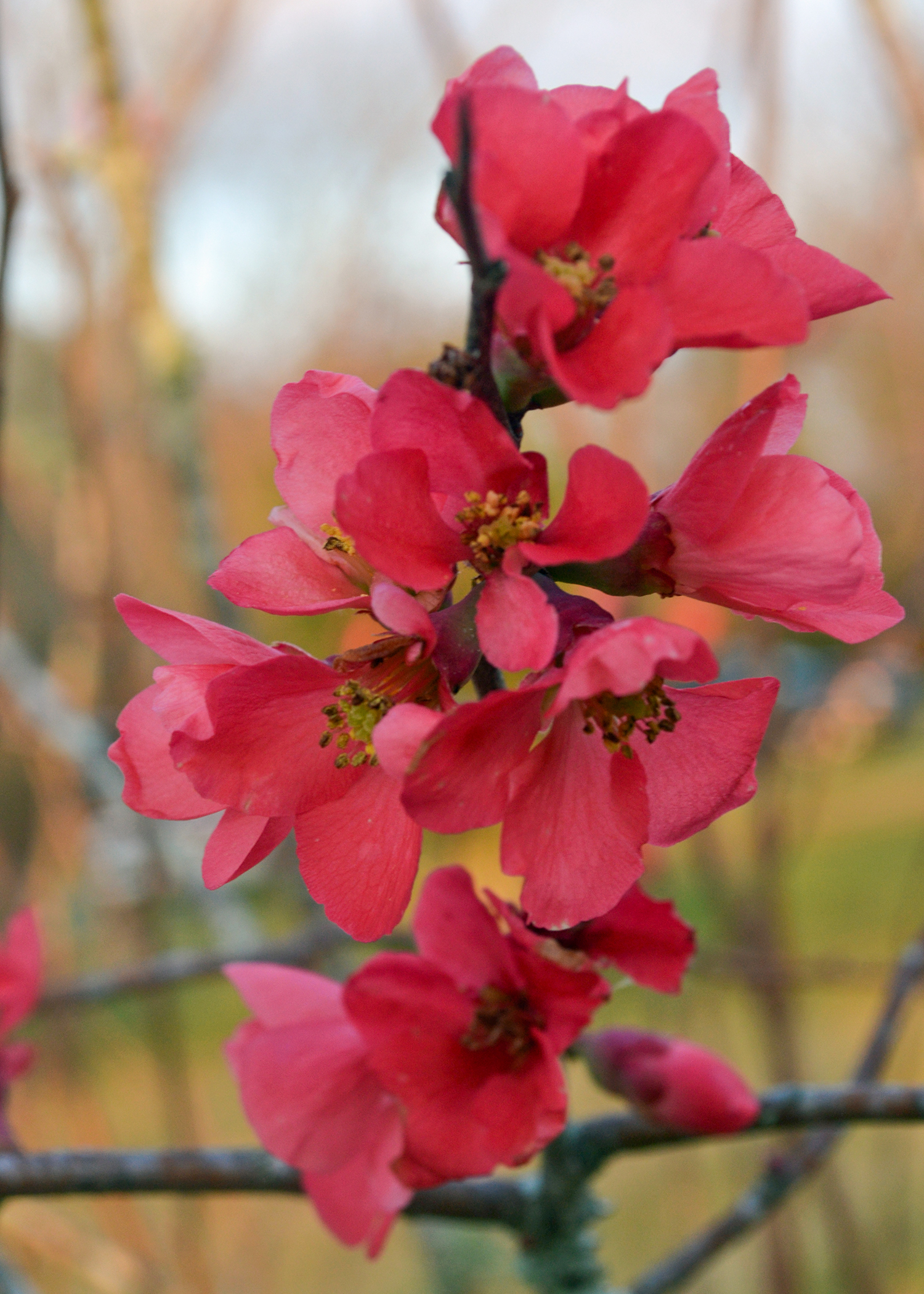 It is a deciduous shrub with arching, sometimes thorny branches, and it blooms on bare wood when most of the landscape is still gray and quiet. Those bright flowers are most often red, but some are pink, coral, peach or white. They seem to almost glow in the winter light.