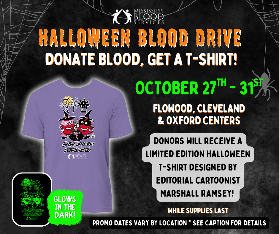 This Halloween, Mississippi Blood Services (MBS) invites you to do something truly life-changing — donate blood and help save lives. Every donor during this special week will receive an exclusive glow-in-the-dark Halloween T-shirt as a thank-you for supporting patients and families across Mississippi.
