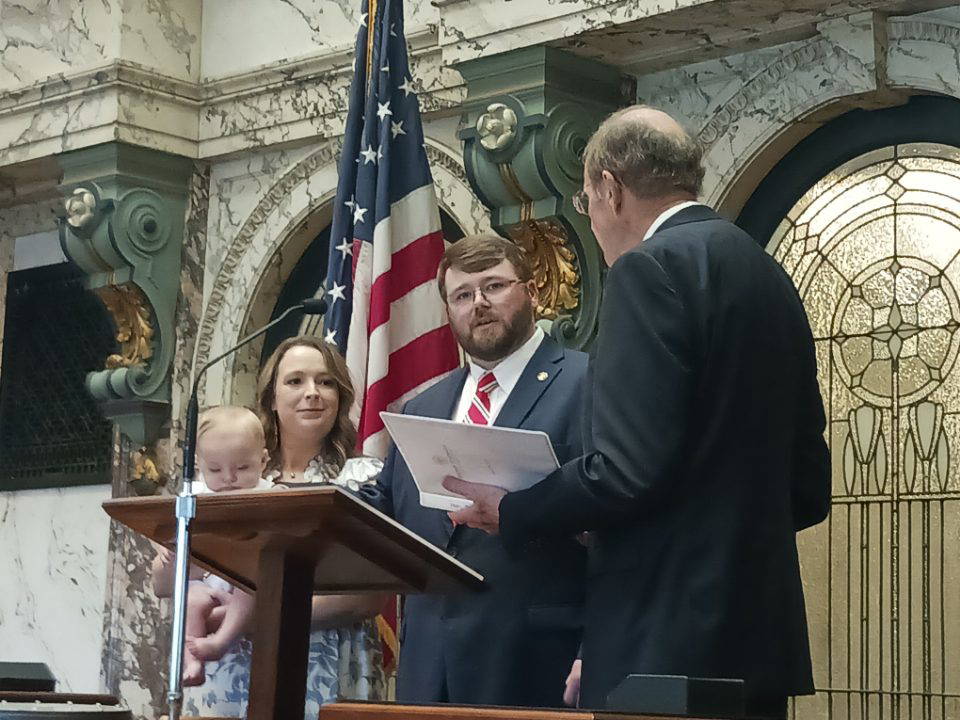 New State Senator Lane Taylor is sworn in by Lt. Governor Delbert Hosemann, April 29, 2025 (Photo by Daniel Tyson | Magnolia Tribune)