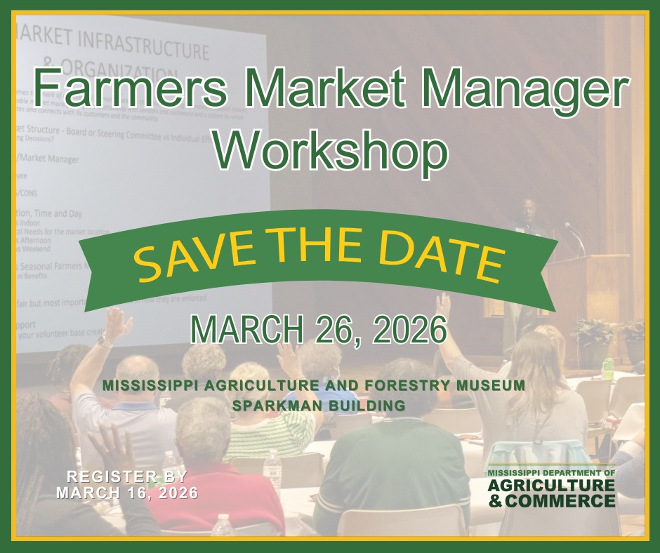 The Mississippi Department of Agriculture and Commerce will host a workshop for farmers market managers, staff, volunteers and board members on Thursday, March 26, from 9:00 a.m. to 3:00 p.m. inside the Sparkman Building at the Mississippi Agriculture and Forestry Museum, located at 1150 Lakeland Drive in Jackson.