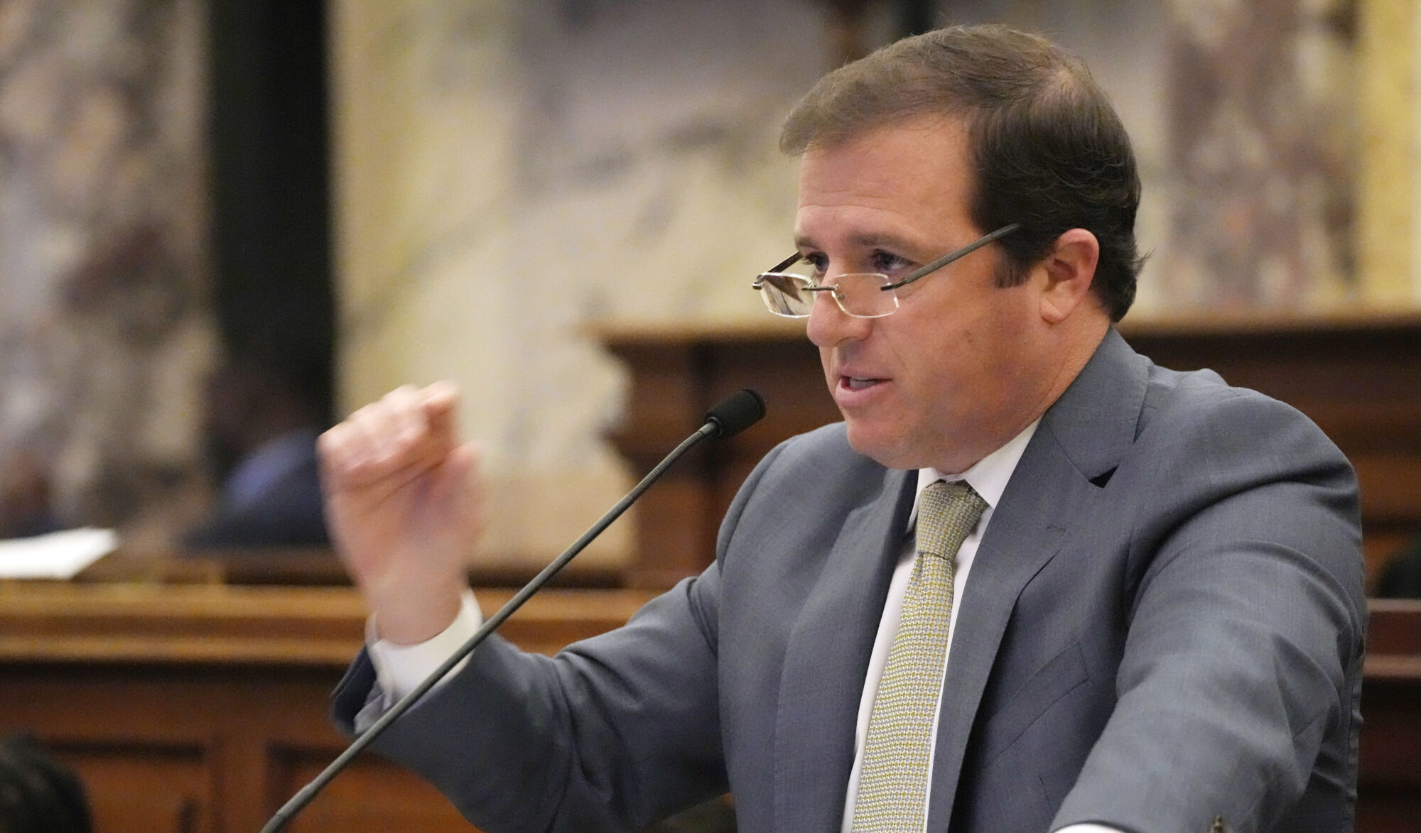 Mississippi State Finance Committee Chairman Josh Harkins, R-Flowood, in the Senate chamber at the Mississippi State Capitol in Jackson, Miss., Thursday, Jan. 25, 2024. (AP Photo/Rogelio V. Solis)