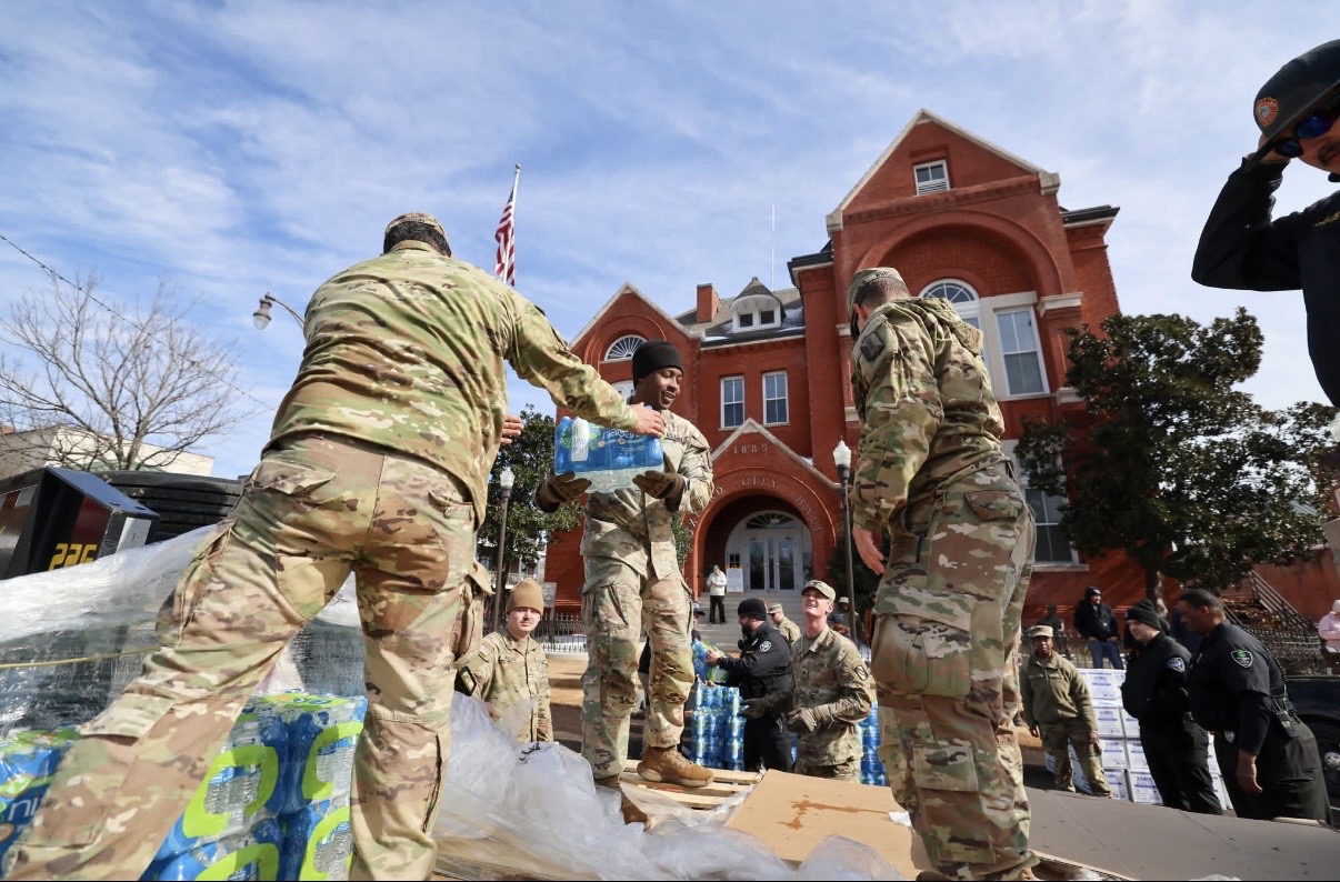 Mississippi National Guard Soldiers distribute bottled water to local officials and community members during winter storm response operations in Oxford, Mississippi, Jan. 29, 2026. Guardsmen are assisting with the delivery and distribution of essential supplies to support communities impacted by severe winter weather. (Photos by the Mississippi National Guard)