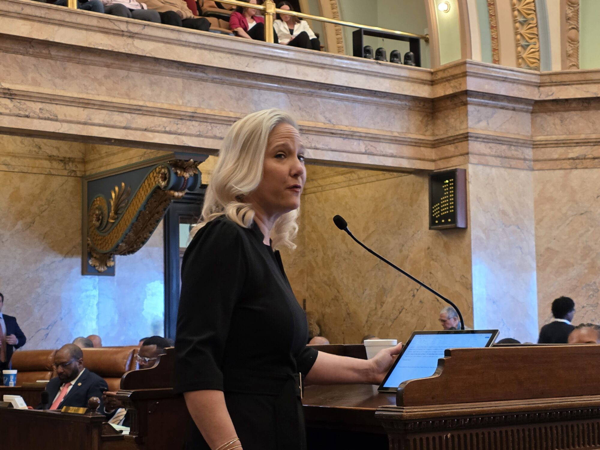 State Rep. Celeste Hurst (R) speaks in support of HB 2 earlier in the 2026 legislative session. Wednesady, she introduced an amendment to include abortion inducing drugs to HB 1613, which was adopted. (Photo by Jeremy Pittari | Magnolia Tribune)