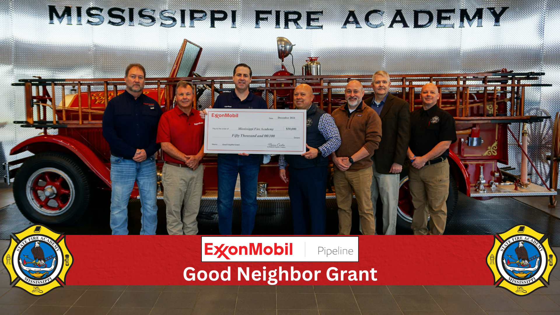 The Mississippi State Fire Academy (MSFA) is proud to announce the receipt of a $50,000 grant from ExxonMobil through its Good Neighbor Grant program. This funding will play a critical role in advancing the safety and preparedness of first responders across the state by supporting the development and implementation of specialized training focused on responding to CO2 pipeline emergencies.