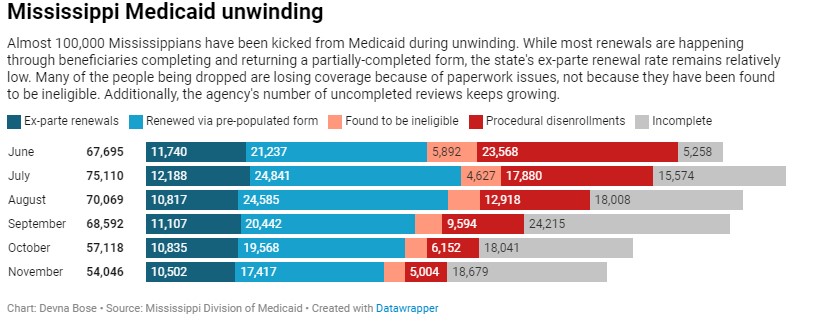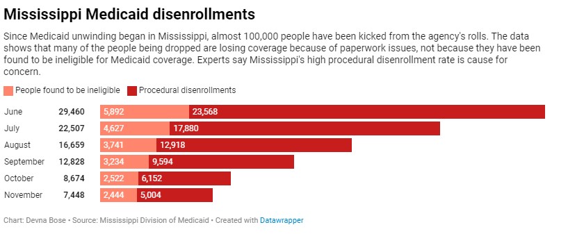 The latest numbers cap six months of disenrollments. In total, nearly 100,000 Mississippians have lost Medicaid coverage since June, when state Medicaid divisions across the country started reviewing their rolls for the first time in three years in a process called “unwinding” after the COVID-19 pandemic.