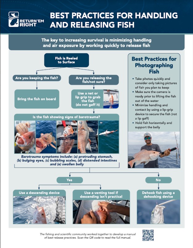 Return ‘Em Right is an angler-driven program that provides training and free release gear to Gulf of Mexico reef fish anglers who are committed to using best release practices and helping the future of the fishery. To date, the program has reached nearly 30,000 offshore anglers. The Best Release Practices Manual, and accompanying fact sheets summarizing pertinent information on catch and release, can be found at ReturnEmRight.org.
