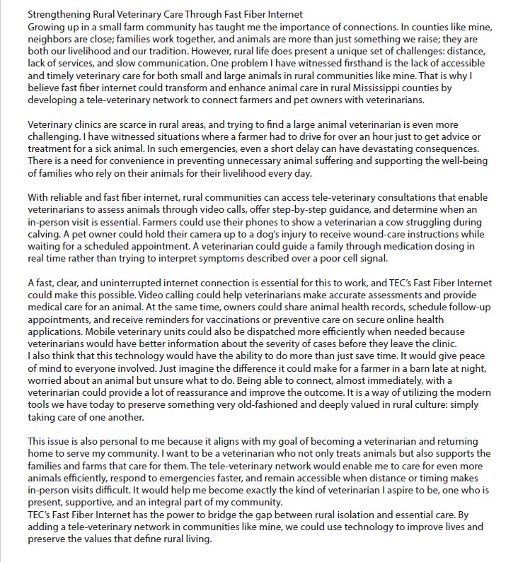 Emma plans to attend Mississippi State University to pursue a Bachelor’s Degree in Animal and Dairy Science. Following her undergraduate studies, she intends to apply to the Doctor of Veterinary Medicine program at Mississippi State University, with the ultimate goal of becoming a Doctor of Veterinary Medicine specializing in large animal medicine.