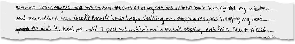 He said one jailer put him in a chokehold until he passed out; he awoke to deputies doing chest compressions on him. They tied him to a chair, squeezed his genitals and punched his head until he lost consciousness again, he said. “When I come to, my ears are ringing. I’m covered in puke and blood,” he recalled.