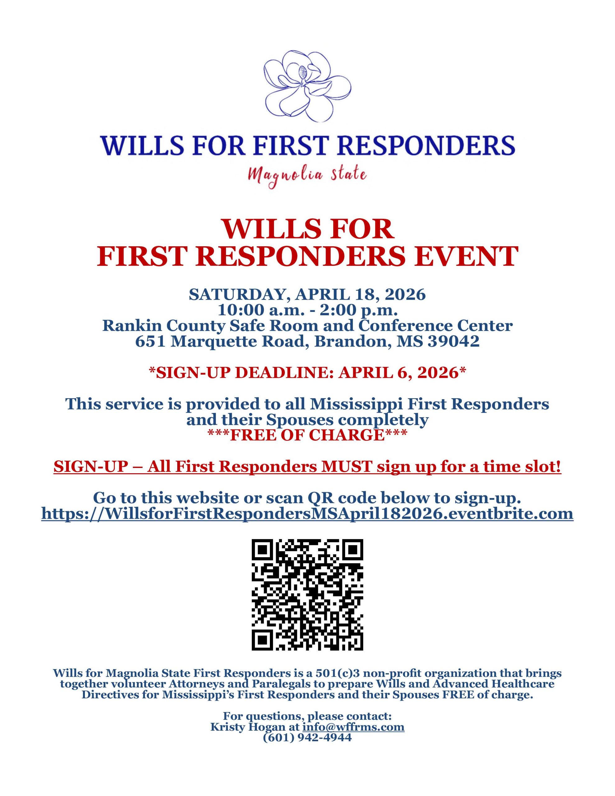 SIGN-UP – All First Responders MUST sign up for a time slot in order to participate at https://WillsforFirstRespondersMSApril182026.eventbrite.com and will be required to fill out an initial questionnaire prior to the event.