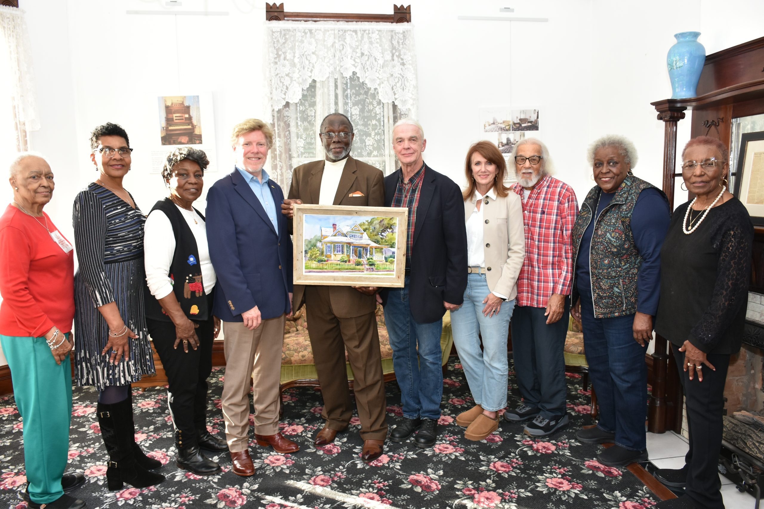 Wyatt Waters of Wyatt Waters Gallery recently donated a giclée print of his painting, “Dr. John Banks House,” to the staff of the Dr. John Bowman Banks Museum at 9. St. Catherine St. From left are Jacqulyn B. Williams, Velua Robinson, Thelma Newsome, Mayor Dan Gibson, Rev. LeRoy White, Wyatt Waters, Kristi Waters, Willie Woods, Dora Hawkins, and Bonita Reed. Photo by Albert L. Jones